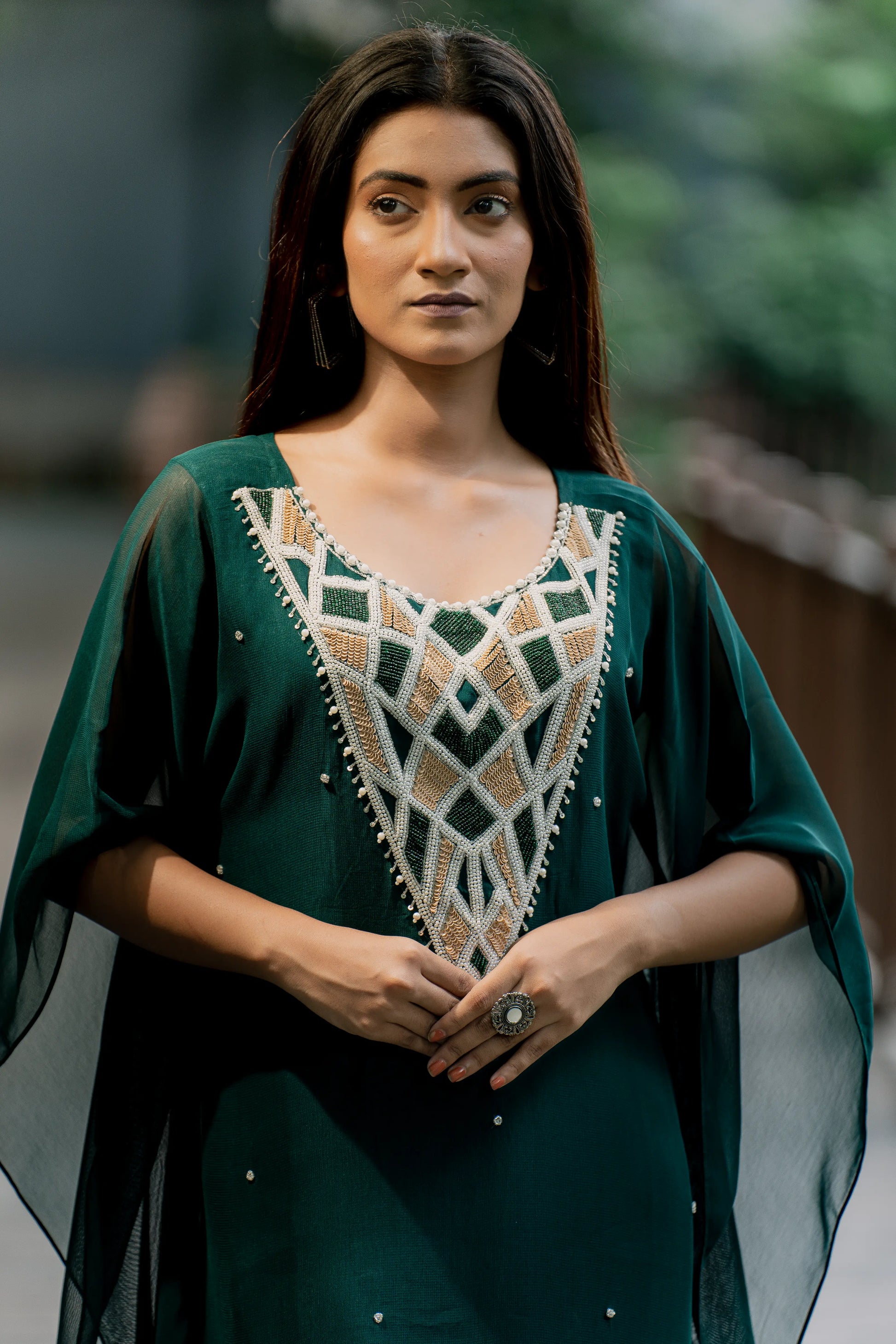 Artisanal Highlights: This design is highlighted by intricate handwork, where sequins are beautifully paired with beads, and complemented by matching green beads that blend seamlessly with the base fabric