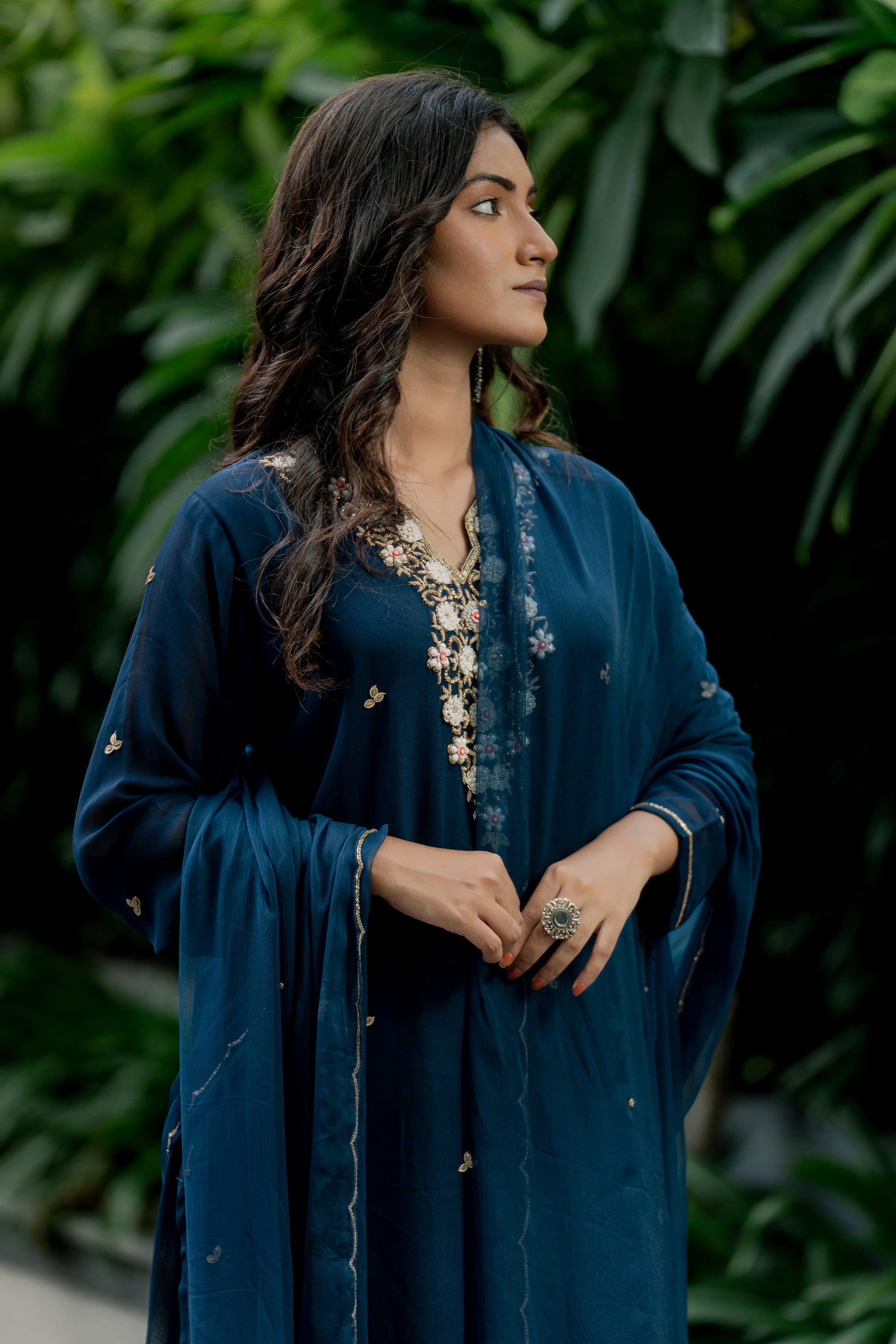 Artisanal Highlights: Intricate zardosi embroidery graces the kurti, featuring gold cutdana, salma, white beads, and shimmering rhinestones. The small floral and leaf-shaped embellishments add vibrant pops of color, while pear-shaped crystals lend a graceful sparkle to the ensemble