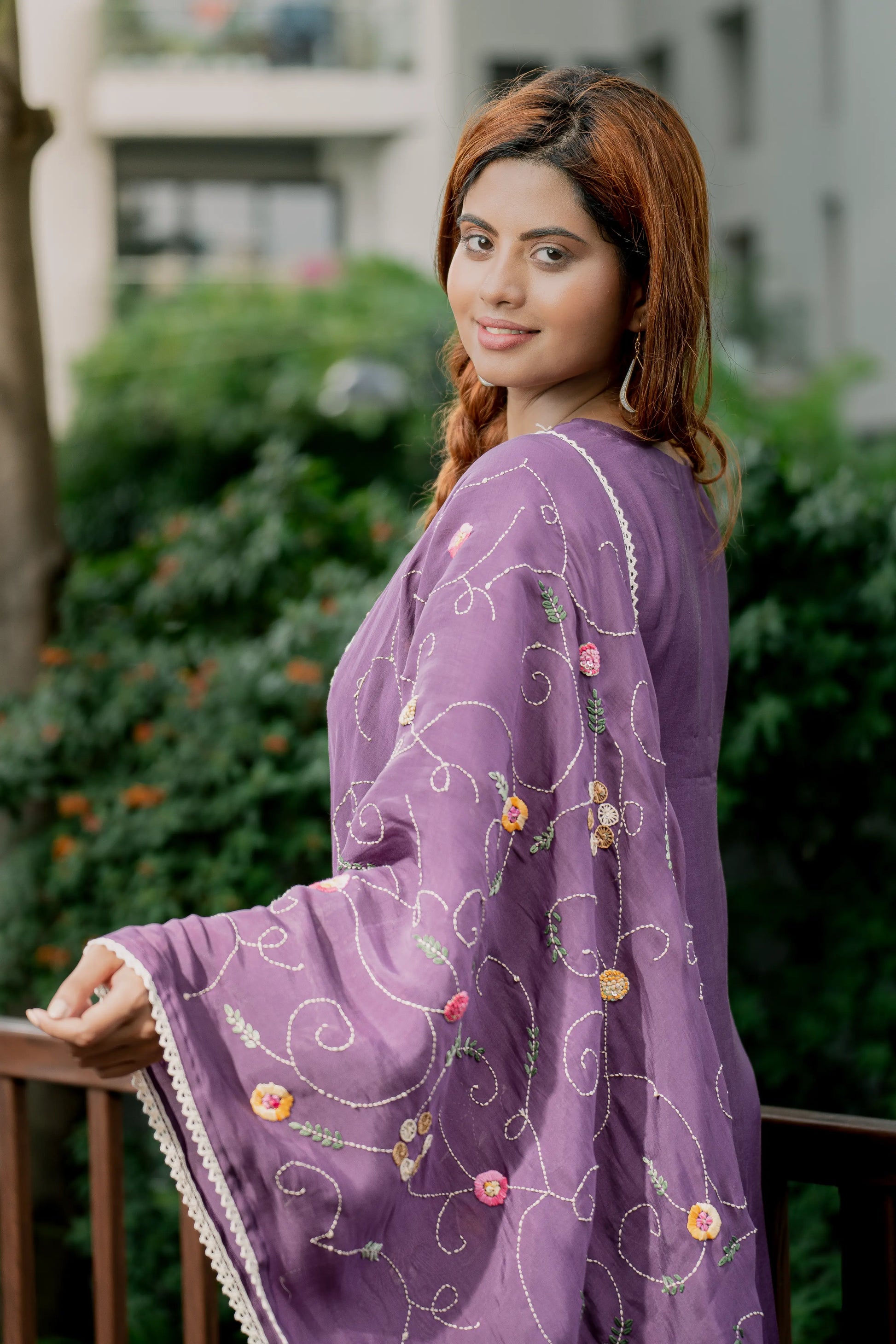 Artisanal Highlights: Adorned with delicate French-knot and spring embroidery, the kurti is enhanced with sequins that add a subtle, luxurious shimmer. The dupatta features intricate kantha jaal work, while the sleeves, pants, and dupatta are gracefully finished with white rick-rack cotton lace, lending a polished and cohesive appeal to the ensemble